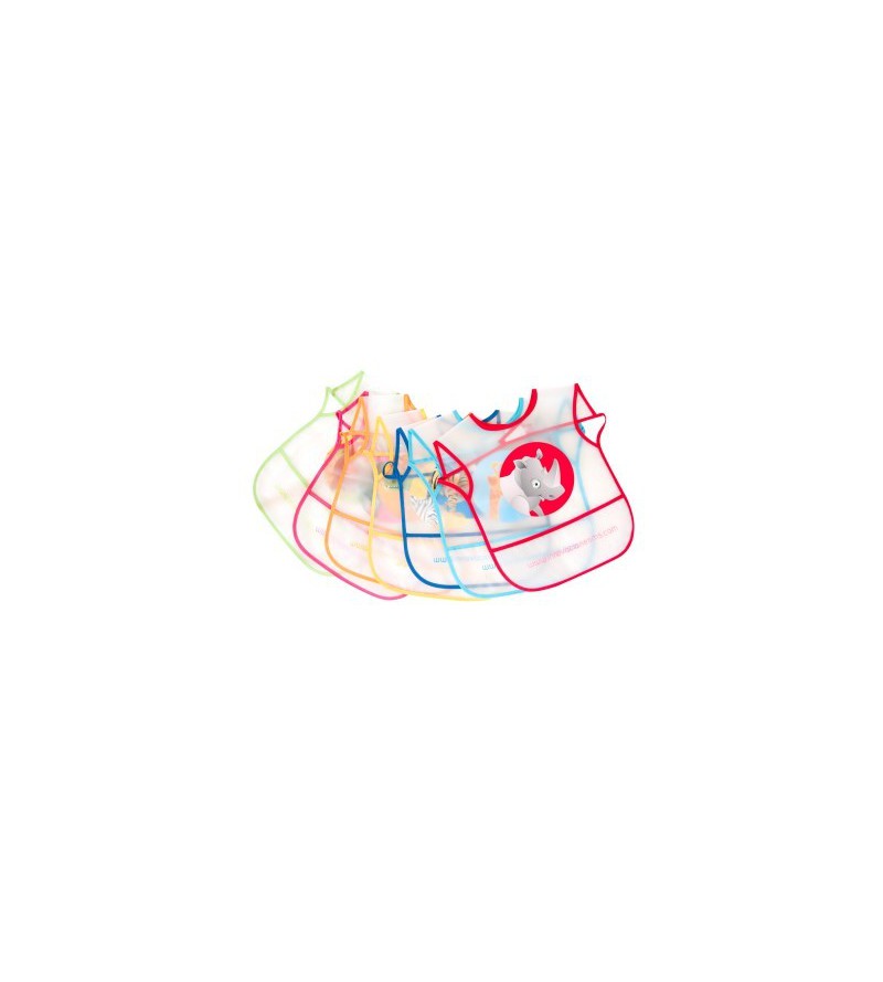 Babero MS plastificado grande 7 unidades: es un pack de baberos que incluyen 7 unidades, fáciles de poner y quitar con velcro y plastificados. Cada babero tiene un color y un animal diferente. Se coloca por los brazos y se ajusta con velcro en la espalda para que no se muevan. Tiene un bolsillo para los sobrantes de comida.