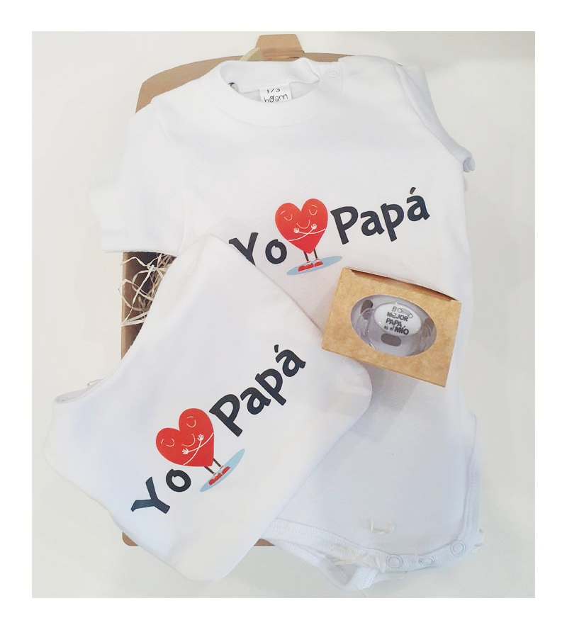 Estamos seguros de que el papá de la casa se enamorará de este regalo. El contenido de la cajita incluye body para el bebé, babero y chupete con frase especial para el papá.
