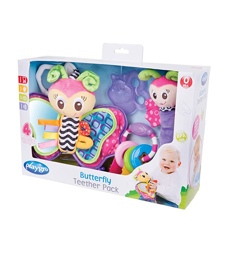 - Activa todos sus sentidos con el Set de Mordedores, Sonajero PlayGro Butterfly. Donde su textura, su suave zona de mordedura, sus sonidos y sus colores atraparan la atención de bebé más inquieto.