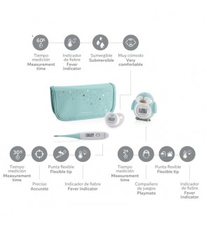 Thermokit es un set que ayuda a los papás a controlar cómodamente la temperatura de sus bebés y la del agua. Compuesto por tres termómetros: uno corporal con punta flexible, uno con forma de chupete y otro para el baño. Su simpático diseño lo convierte en el kit ideal para regalar.