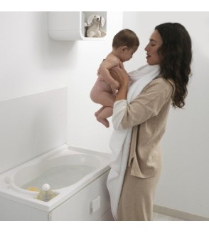 La capa de baño delantal está diseñada para abrocharse alrededor del cuello y así tener las manos libres para sacar al bebé de la bañera y arroparlo de manera segura.