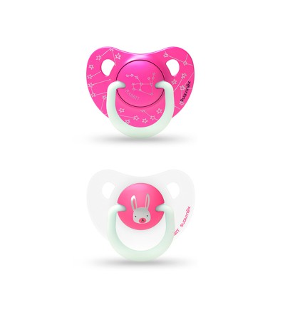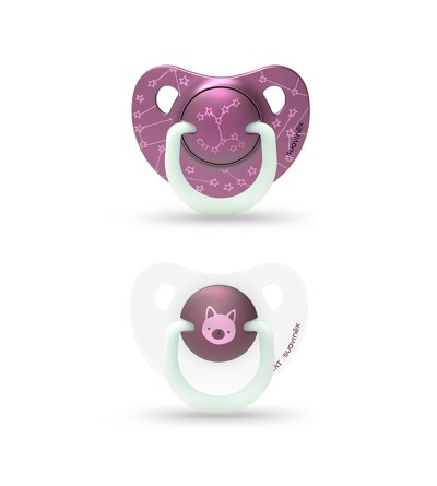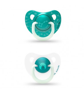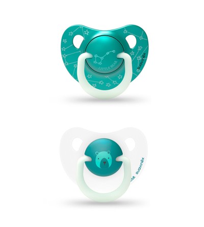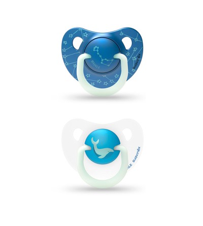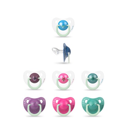 Se presentan en un pack de dos unidades, un chupete especial para el día y otro chupete para la noche. Ambos chupetes disponen de la anilla luminiscente que brilla en la oscuridad para encontrar el chupete fácilmente en la cuna del bebé si se le cae.