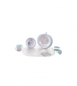 Incluye: salvamanteles, ventosa de silicona para fijar la base de los platos, bol, plato llano, plato termo con embudo, cuchara, cuchara de silicona, tenedor de melanina y taza de tapa con boquilla.