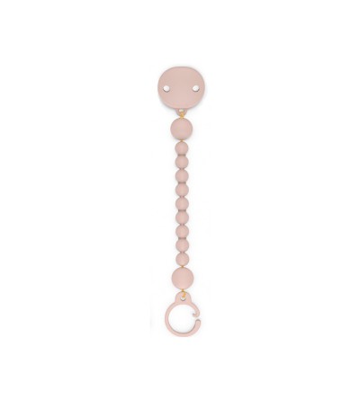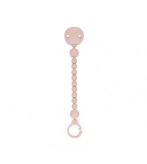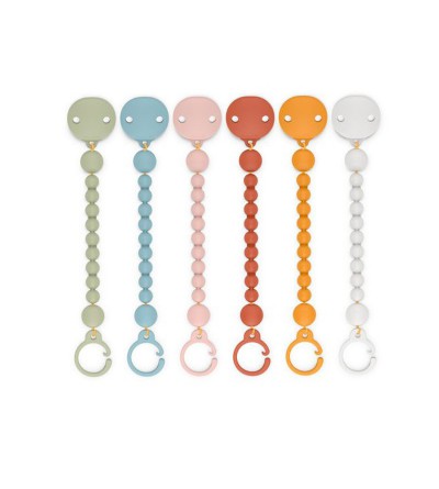 Fabricado en silicona de grado alimentario, que ayuda a sujetar el chupete del bebé y a evitar que se pierda o caiga al suelo. Tiene una pinza metálica resistente y cumple con las normativas de seguridad europeas.