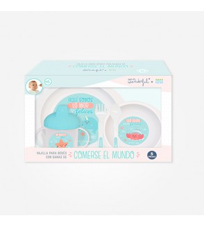 Compuesta por plato, bol, taza antigoteo, cuchara y tenedor.