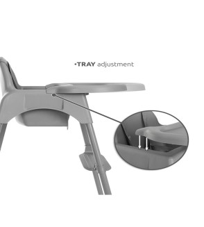 La bandeja ajustable se adapta a las necesidades de crecimiento, y cuando no se utiliza, puede montarse en las patas traseras de la silla, ahorrando espacio.