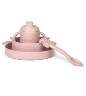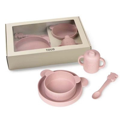 Vajilla de 4 piezas Tous baby de bebé, compuesta por taza con tapa y asas, plato, bol y cuchara. Ideal para el aprendizaje y facilitar la alimentación del bebé.
