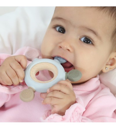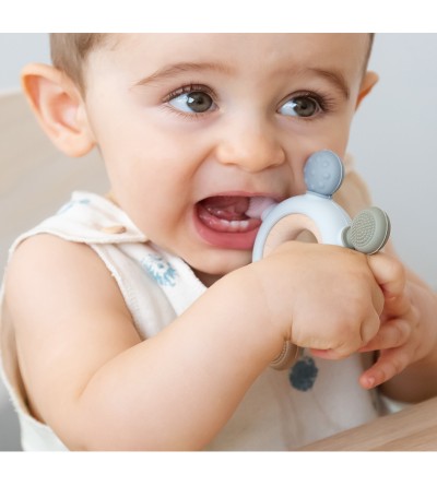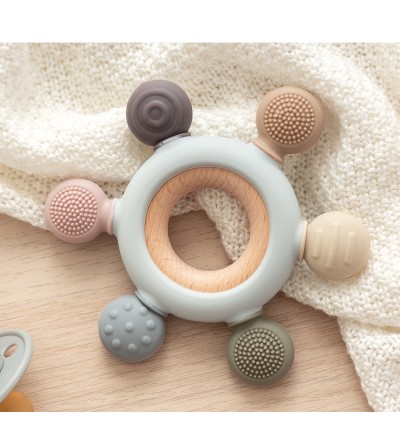 La dentición suele comenzar entre los 4 y los 7 meses y puede ser una época frustrante tanto para el bebé como para los padres. Puede que el niño babee más y quiera morder objetos, y seguramente resultará molesto y el niño estará más irritable.Para aliviar estos síntomas, debemos dar al bebé algo para morder. Para ello contamos con una completa colección de mordedores en silicona y madera de haya, muy fáciles de sujetar, con diferentes colores y texturas para masajear las encías, y mejorar los síntomas de la dentición de tu bebé.Nuestro mordedor es un juguete perfecto para que juegue y pueda aliviar esas molestias de la dentición del bebé. Tiene forma redonda con salientes redondeados para que lo coja con facilidad con una o dos manos y pueda jugar con él además de morderlo. Estimula sus sentidos de la vista y el tacto gracias a sus distintas texturas. Sus bordes están hechos de suave silicona para que lo pueda morder tanto como quiera. Está fabricado en suave silicona de alta calidad, ofreciendo las ventajas de este material: no absorben olores ni sabores y su forma y textura se mantienen inalteradas con el uso y el contacto con otras sustancias. Puedes soltar la silicona de la madera para una mayor higiene de los materiales por separado.Está recomendado para niños de +3 meses.Los pequeños gestos para proteger nuestro planeta son muy importantes. Inculcar estos valores a los peques desde el principio es básico, y darles lo mejor nuestra prioridad. Por ello, en nuestro catálogo incluimos artículos amigables con el medio ambiente y presentados en envases más respetuosos.· Material: madera de haya y silicona.· Lavar con agua tibia y jabón. · No use materiales abrasivos y/o artículos de limpieza afilados, rugosos o puntiagudos.
