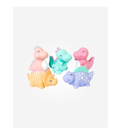 Cinco dinosaurios la mar de adorables. Con ellos el baño se convertirá en el momento más alegre y divertido del día. ¡Un set imprescindible para jugar a diario!