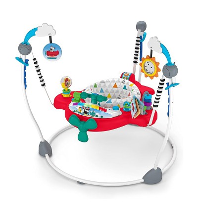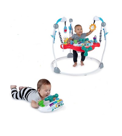 Ponga rumbo al descubrimiento de su hijo con el saltador multiactividad 2 en 1 Airplane Adventure Ocean Explorers de Baby Einstein, que permite a su pequeño pilotar un avión hacia una aventura multisensorial con más de 20 melodías, sonidos y luces, un asiento ajustable a 4 alturas que gira 360 grados y mucho más. Con cada rebote, el niño activa las canciones y luces del saltador para un despegue que estimula los sentidos. La estación de juego electrónica extraíble ofrece 10 componentes interactivos, incluidos 7 botones, un acelerador y un volante para ayudar al niño a pilotar. El niño puede aprender formas, colores y números en 4 idiomas: inglés, español, francés y alemán. Los 7 juguetes y las actividades multisensoriales fomentan habilidades de desarrollo como la causa-efecto y la destreza manual. Los queridos personajes de Exploradores del Océano de Baby Einstein, como Cal, Zen y Neptuno, serán los copilotos del pequeño.Adecuado para niños de 6 meses a 1 año o hasta 25 lbs, lo que ocurra primero, con las plantas de los pies capaces de tocar el suelo de forma segura y firme. No utilizar cuando el niño sea capaz de andar. Requiere 3 pilas AA. Las superficies son fáciles de limpiar y el acolchado extraíble del asiento se puede lavar a máquina.