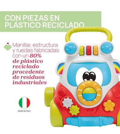 Este juguete posee un diseño infantil muy llamativo y sostenible: con ruedas grandes, asa amplia para agarrarse, y fabricados en un 80% de plástico reciclado procedente de desechos industriales.