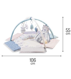 El juego 3 en 1 (arco de juego y alfombra de juego) de MoMi es un juguete infantil seguro para desarrollar las habilidades sensoriomotoras de los bebés desde el nacimiento. El juego incluye un arco de juego con una alfombra de actividades sensoriales, 5 juguetes sensoriales que se adhieren al arco de juego, una bolsa de almacenamiento con 30 pelotas y un cojín para gatear con forma de ardilla. Los diferentes colores, formas y sonidos estimulan el desarrollo motor y audiovisual del bebé y su sentido del oído en los primeros meses de vida. Los peluches promueven la percepción táctil y háptica. La alfombra de juego tiene las dimensiones 106 x 106 x 55 cm. Con unos sencillos pasos, los bordes de 17 cm de altura se pueden plegar para crear un parque de 83 x 72 x 55 cm. Las 30 bolas blandas se pueden llenar para que el bebé pueda jugar en un baño de bolas secas. Información del Producto: ? Arco de juego con tapete de actividades sensoriales con bordes plegables ? Dimensiones desplegado: 106 x 106 x 55 cm ? Dimensiones con los bordes plegados: 83 x 72 x 55 cm ? Incluye 5 juguetes colgantes ? Incluye 30 bolas de plástico con bolsa de almacenamiento ? Incluye 1 x cojín para gatear Instrucciones de cuidado: La tapicería se puede lavar a 30 °C en un programa para prendas delicadas oa mano. No girar. Dar forma y colgar para secar. Las bolas y el marco del arco se pueden limpiar con un paño húmedo y un detergente suave.