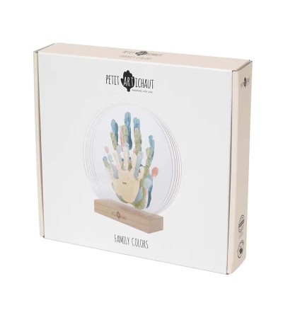 Family Colors es un marco transparente que muestra las huellas de 5 miembros de la familia y luego las combina para crear una obra de arte colorida y verdaderamente única. Family Colors ofrece una forma moderna y original de mostrar la unidad y el amor familiar a través de una decoración interior distintiva