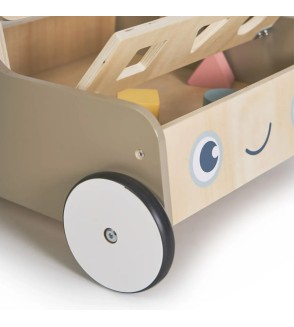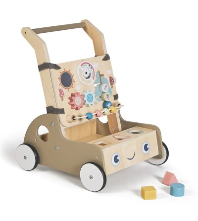 Fabricado con materiales duraderos como madera de pino, MDF y hierro, este correpasillos incluye bordes redondeados y acabados no tóxicos. Su montaje es rápido y sencillo gracias a las instrucciones ilustradas y al mini destornillador incluido.