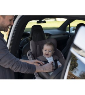 Alta seguridad y confort del recién nacido. El Nido de Seguridad proporciona el ángulo de asiento ideal y hecho a medida para bebés, idéntico al que tenemos con una sillita grupo 0. Consiste en un cojín reductor en dos partes, con EPS integrado y una cubierta exterior con Dynamic Force Absorber en los lados, lo que le brinda a la silla una capa adicional de protección contra impactos laterales. Newborn Hugger está ubicado dentro del Nido de Seguridad y se compone de una combinación de materiales blandos en los lados y una cuña colocada de manera inteligente alrededor de la espalda del niño. Ambas inserciones arropan y protegen al recién nacido y levantan la espalda, en lugar de la parte inferior, para que su hijo obtenga la posición más cómoda para sentarse.
