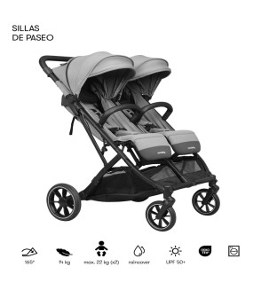 La silla de paseo gemelar Tour Twin Max ofrece comodidad y seguridad para tus peques, con asientos reclinables y ruedas todoterreno. Ideal para paseos en familia, es muy ligera y fácil de maniobrar.